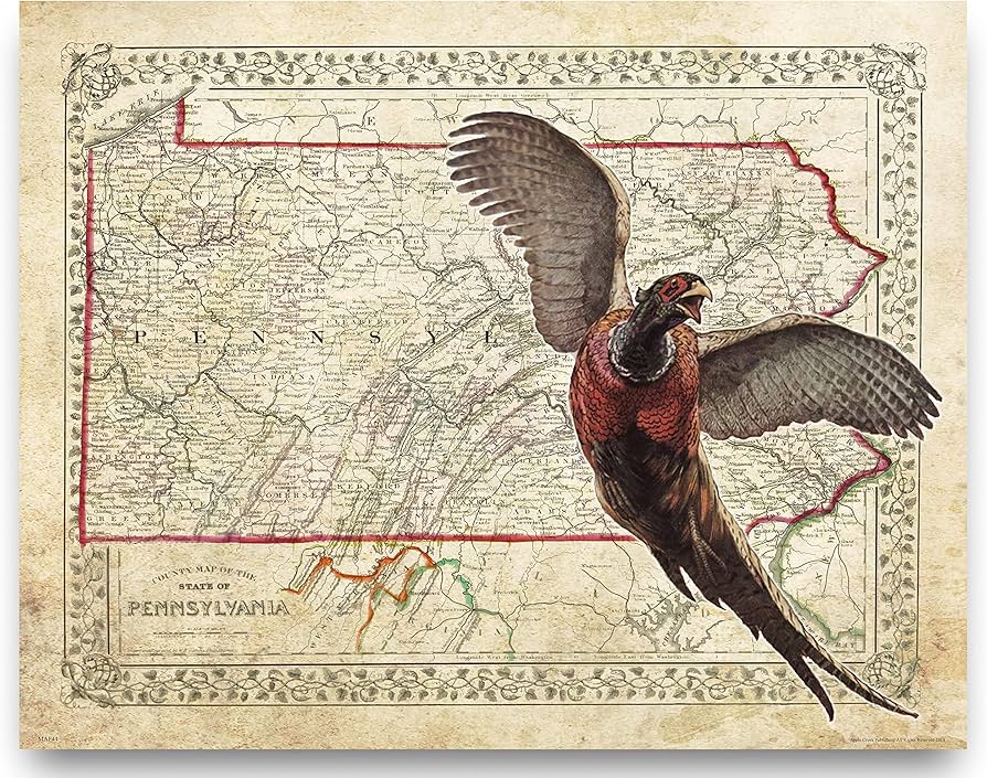 Vintage Pennsylvania State Map Art Print Pheasant Hunting Fishing