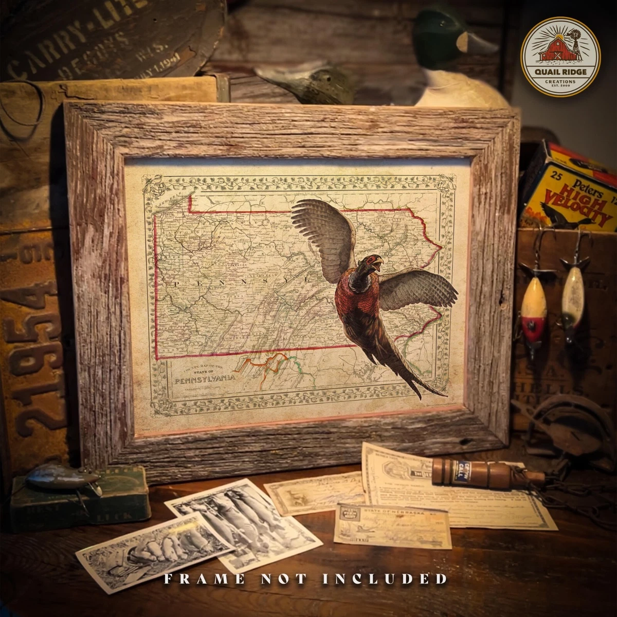 Vintage Pennsylvania State Map Art Print Pheasant Hunting Fishing
